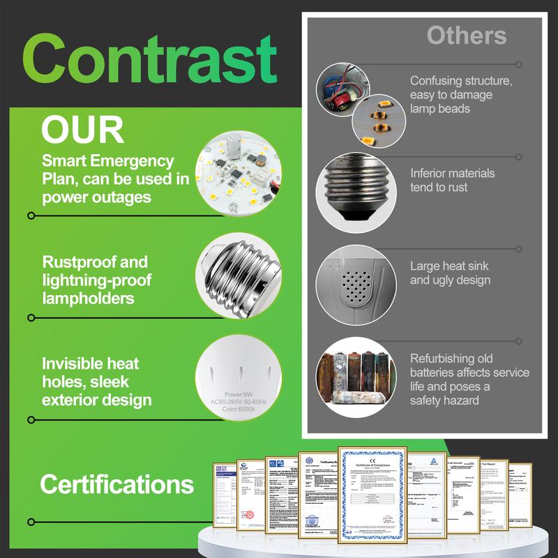 This rechargeable emergency LED light bulb works like a normal household bulb while power is on and automatically switches to its built-in battery backup during power outages. It provides reliable, bright light when electricity goes out, making it ideal for home emergencies, storms, blackouts, camping, garages, basements, and emergency preparedness kits. The bulb self-charges while installed in a standard light socket and requires no wiring or setup.